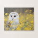 Chouette blanche mignonne dans un champ de fleurs sauvages jaunes.