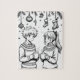 A cozy scene unfolds as two characters, a boy and a girl, stand side by side, each holding a steaming mug. The camera slowly zooms in, capturing their warm expressions and the intricate details of their festive sweaters. Surrounding them, holiday decorations hang from above, creating a cheerful atmosphere. Soft, diffused lighting enhances the mood, casting gentle shadows that dance across the puzzle backdrop. The scene flows with a heartwarming rhythm, inviting viewers into a moment of shared joy.