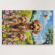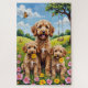 Une scène de famille joyeuse de Cockapoo dans une prairie lumineuse de boutons d'or. Avec un chien adulte heureux et deux chiots adorables, cette œuvre d'art capture la joie de vivre, la chaleur et la beauté colorée du printemps - parfaite pour les amoureux des chiens et la décoration joyeuse.