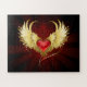 Coeur rouge vif d'un ange aux ailes dorées brillant dans l'arrière - plan rouge foncé et rayonnant décoré d'un motif.