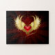 Coeur rouge vif d'un ange aux ailes dorées brillant dans l'arrière - plan rouge foncé et rayonnant décoré d'un motif.