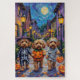 De charmants Cockapoos vêtus de costumes d'Halloween ludiques portent des seaux de citrouille tout en allant chercher des friandises sous le ciel éclairé par la lune. Ce design festif met en valeur le pelage duveteux de la race, sa nature affectueuse et sa personnalité joyeuse, capturant parfaitement l'atmosphère effrayante mais amusante de la nuit d'Halloween. Une célébration charmante pour les amoureux des chiens et les fans d'Halloween.