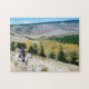 The photographic image on this puzzle is a beautiful scenic image of a Colorado cowboy on his gray horse start ing to descend the prairie slope of a mountain in the splendor of early autumn. Gold aspen trees contrast with green pine trees in the valley below, and a distant mountain range shows the colors of autumn while a bright blue sky is above. *Photo credit to Debra Mickelson; tous rights reserved.