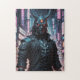 Cette image intense dépeint un dangereux samouraï démon, orné d'une tenue futuriste et sombre et d'un masque aux yeux et cornes rouges brillants. Situé dans un environnement urbain néon-éclairé inspiré de l'esthétique cyberpunk, le personnage se dresse au milieu de nombreux signes et symboles illuminés, suggérant un paysage urbain animé et high-tech.