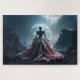 Une figure mystérieuse dans une robe élaborée se dresse devant une lune pleine et brillante, dressée contre un paysage rocheux dramatique. La scène est rehaussée par le contraste entre les détails complexes de la robe et le terrain accidenté.