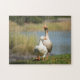 Puzzle personnalisable de deux oies marchant le long de l'herbe au bord de la rivière tôt le matin.