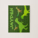 Puzzle de dinosaure T-rex avec nom personnalisé. Illustration préhistorique d'animal sauvage avec texte personnalisé. Amusant Anniversaire ou idée cadeau de Noël pour les garçons et les filles en dinos. Silhouettes Terranosaurus rex vert avec modèle de typographie audacieux. Choisissez parmi de petites ou grandes pièces avec lesquelles jouer. Jouets sur mesure pour enfants.