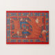 Un chat et chaton à la marmelade sur un tapis rouge, bleu et jaune à thème de poisson. Jigsaw puzzle avec un design personnalisable pour vous de personnaliser avec votre propre texte, photos et idées. Un dessin original au crayon coloré par Jess perry.