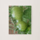 Ce puzzle impressionnant présente une photographie d'une bande de tomates cerises vertes non mûres poussant sur un plante de tomates dans un jardin de banlieue. La photo a été prise en utilisant la macro photographie pour un résultat détaillé.