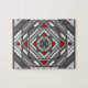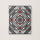 Un mandala carré concentrique prend l'apparence d'un tunnel qui attire le spectateur avec une combinaison de lignes angulaires, de triangles et de cercles dans les tons gris, rouge et blanc pour presque créer une illusion d'optique.