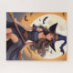 Puzzle. Une jeune sorcière joyeuse aux cheveux longs court un bâton de brosse devant une grande lune brillante. Les chauves-souris volent autour d'elle, ajoutant à l'enchanteresse scène nocturne.
