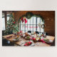Belle scène folklorique traditionnelle de Noël Dîner étalé sur la table. Les minuscules anges encadrent la police rouge festive Typographie nom de famille que vous pouvez personnaliser via le menu d'édition Zazzle. Un merveilleux puzzle Jigsaw avec un degré de défi pour la famille de travailler ensemble après le déjeuner.