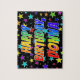 Cette conception amusante et animée de puzzle sur le thème de l'anniversaire comprend le message "HAPPY BANTHDAY, DONNA" avec les personnages ayant un spectre arc-en-ciel coloré inspiré motif dégradé, ainsi qu'un passionnant motif arrière - plan de champ étoile. Un puzzle coloré comme celui-ci pourrait être une façon amusante d'envoyer des salutations d'anniversaire à quelqu'un nommé Donna. [~Z0000468]