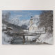 Photo Jigsaw puzzle d'une église sous une couche de neige à côté d'un ruisseau de montagne et d'un pont avec les Alpes dans le arrière - plan dans un paysage hivernal à Ramsau bei Berchtesgaden dans le Berchtesgadener Land de Bavière, sud de l'Allemagne, près de la frontière avec l'Autriche.