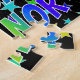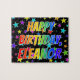 Ce puzzle dynamique et animé sur le thème de l'anniversaire a le message "HAPPY BANTHDAY, ELEANOR" avec les personnages ayant un motif coloré du spectre arc-en-ciel inspiré de gradient, ainsi qu'un champ amusant d'étoiles arrière - plan motif. Un puzzle vibrant comme celui-ci pourrait être utilisé pour envoyer un message d'anniversaire à quelqu'un nommé Eleanor. [~Z0000468]