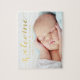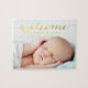 Simple moderne élégant bébé naissance Faire-part photo Puzzle | Gold Foil Welcome Script. Elke Clarke Designs ©. Plus de styles disponibles dans notre boutique. La typographie de feuille d'or (effet photo imprimé) recouvre le mot "bienvenue" dans une police de script manuscrite. Design simple, élégant et polyvalent que vous pouvez customiser.