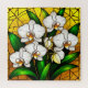Une exposition artistique d'orchidées blanches dépeintes dans un style d'art vitrail animé, mettant l'accent sur les teintes dorées de l'arrière - plan à la végétation luxuriante. Parfait pour les thèmes floraux et décoratifs.