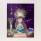 Ce superbe puzzle présente une belle fille méditant sur un tapis de yoga entouré de cristaux, de bougies et de bambou chanceux dans une belle chambre avec un mur violet profond et carrelage au sol et des oeuvres d'art dorées. Le texte dit "en paix..." mais peut être changé pour comporter un nom !