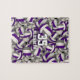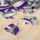 Ce puzzle de volley-ball personnalisé pour les filles ou les garçons présente un motif apparemment sans fin de volley-ball de tailles et de profondeurs différentes, tourné dans tous les sens - certaines des balles de volley-ball ont des panneaux violets et gris - personnaliser avec le nom du joueur de volley-ball et son numéro de maillot - par katz_d_zynes