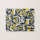 Ce puzzle bleu et or de l'équipe couleurs volleyball jigsaw puzzle pour les filles ou les garçons dispose d'un motif apparemment sans fin de volleyball de tailles et à des profondeurs variables, tourné partout - certaines des volleyballs ont des panneaux bleu et or - personnaliser avec le nom du joueur de volleyball et le numéro de maillot - par katz_d_zynes