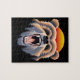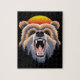 Ours grizzli rugissant devant un coucher de soleil avec forêt sur l'arrière - plan. Puzzle pour les amateurs d'ours et de faune sauvage.