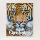 This design features a close up of a beautiful fierce tiger's face, with his dramatic orange, black and white stripes and striking eyes. You can easily personalize with a name for a fun gift for an animal lover.