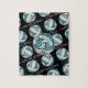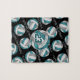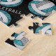 Ce puzzle motif de volleyball pour filles dispose d'un plus grand volley-ball turquoise, gris et blanc stylisé, sur lequel son nom et son numéro de maillot peuvent être personnalisés, recouvrant un motif de plus petites volleyballs turquoises, gris et blancs sur un arrière - plan noir et "I love volleyball" texte de style lettre de variété en gris s'étirant entre les rangées inclinées de volleyballs - par katz_d_zynes