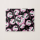 Ce puzzle motif de volley-ball pour filles présente un plus grand art rose, noir et blanc, stylisé volleyball, sur lequel son nom et son numéro de maillot peuvent être personnalisés, surplombant un motif de petites volleyball rose, noir et blanc sur un arrière - plan noir et "I love volleyball" texte de style lettre de variété en rose s'étirant entre les rangées anglisées de volleyballs - par katz_d_zynes