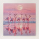 Des flamants roses se dressent gracieusement le long d'une plage reflétée dans l'eau calme, lorsqu'une pleine lune rose se lève dans le ciel pastel