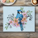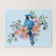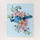 Un oiseau de geai bleu entouré de fleurs printanières rose, violet et pêche de couleur pastel sur fond bleu clair.
