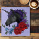 Une licorne noire avec des fleurs bleues, violettes et rouges sur fond de violet clair