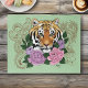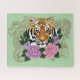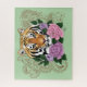 Portrait tigre aux fleurs rose et violet clair. Du henné tout autour du tigre dans un décor de vert.