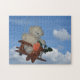 Weißer Teddy Bär fliegt in einem Holzflugzeug unter blauem Himmel mit weißen Wolken