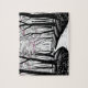 Le dessin est un dessin noir et blanc d'un chemin dans une forêt. Il y a un petit sentier de marche à travers cette forêt où les observateurs remarqueront les feuilles abstraits violets qui survolent la forêt.