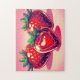 Puzzle détendu - fraise rouge avec dessin mignon au coeur - Cette belle bande dessinée de style animé a généré Image montre fraises rouges juteuses sur un Arrière - plan rouge clair. La fraise au premier plan a le coeur rouge mignon dessus.