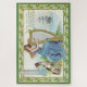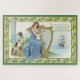 Puzzle vintage de la Saint-Patrick avec texte gaélique : "Erin Mavourneen ! Sweet Erin Go Bragh !" et une belle image d'une jeune Irlandaise jouant de la harpe avec son chien debout à côté et un navire naviguant sur l'océan en arrière-plan.