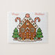Fun festive puzzle with a gingerbread house, designed with candy canes and Christmas trees and a Happy Holiday greeting. Great for family fun or gifting to others for the holidays.