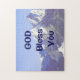 Dieu Béni vous puzzle Bleu avec des montagnes enneigées.
