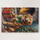 This lush acrylic painting captures the happy, gentle spirit of the Golden Retriever, sitting patiently by a warm fireplace and guarding a beautifully wrapped Christmas gift. A cozy and detailed holiday design.