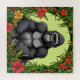 Gorilla présentée dans un cadre circulaire décoratif entouré de bambous luxuriants, de fleurs et de verdure, mettant l'accent sur la nature tropicale et la beauté de la faune.
