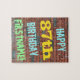 Cette conception amusante de puzzle sur le thème de l'anniversaire comporte un message comme "HAPPY 87th BIRTHDAY, FIRSTNAME!", où le nom peut être personnalisé. L'arrière - plan est représenté par un mur en brique composé de briques de couleur rougeâtre. Le texte du message personnalisable comporte des couleurs comme le bleu, le jaune et le vert, et il a un aspect inspiré de celui des graffitis peints. Un puzzle comme celui-ci pourrait être utilisé comme une façon amusante d'envoyer des voeux d'anniversaire à quelqu'un qui célèbre son quatre-vingt-septième anniversaire, et qui peut-être aime vraiment faire des casse-tête. [~Z0000285]