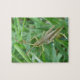 Ce puzzle impressionnant présente une macro photo détaillée d'une petite sauterelle verte avec des marques marron tressées sur l'herbe. Sur la photo vous pouvez voir le détail des jambes articulées, des antennes longues et des yeux noirs et or de la sauterelle.