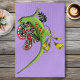 Un gecko vert avec des marques rouges est sur un dessin tribal noir, rouge et blanc en toile de fond de violet