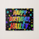 Cette conception de puzzle en forme de pièce excitante et vibrante sur le thème d'un anniversaire porte le message "Joyeux Anniversaire, Hailey" avec les personnages ayant un motif dégradé inspiré du spectre coloré de l'arc-en-ciel, ainsi qu'un motif d'arrière-plan de champ d'étoiles animé. Un puzzle aussi excitant pourrait être utilisé pour envoyer des vœux d'anniversaire à quelqu'un du nom de Hailey.