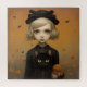 Portrait d'une petite fille bizarre et éffrayante mais mignonne avec un chat sur ses genoux. Illustration Halloween