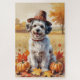 Un tableau aquarelle d'un chien gai assis au milieu d'un tas de feuilles d'automne vibrantes, entouré de minuscules citrouilles et de glands épars. Le chien porte un petit casquette pèlerin et des poutres de joie, capturant l'esprit de Thanksgiving. Dans l'arrière - plan, les champs de moissons et les arbres dorés créent une ambiance campagnarde paisible. Des textures douces et des tons d'automne chauds et feutrés confèrent à la scène une atmosphère cosy et nostalgique parfaite pour célébrer la beauté de la saison.