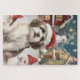 Ce design festif reflète l'esprit joyeux de la période des fêtes, avec un adorable petit portant un chapeau de Père Noël. Le chien est niché dans un pays des merveilles hivernales, avec un bonhomme de neige, un sapin de Noël décoré et des cadeaux joliment emballés. Les flocons de neige tombent doucement, ajoutant une touche magique à la scène, tandis que les couleurs vives des décorations de vacances créent une atmosphère chaleureuse et joyeuse.