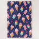 Pattern on blue background with creamy ice cream and popsicles, cherries and confetti floating around. Cute whimsical food design.
