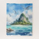 Mystérieuse île au milieu de l'océan entourée de mouettes. Et ces maisons que je vois sont-elles au bord de la jungle ? Dans le style d'une aquarelle.