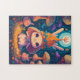 Puzzle coloré d'une reine lapin dans une forêt aux champignons. Illustration animale de scène nocturne avec un style lunatique magique.
